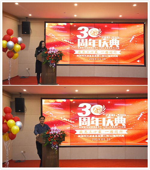 2019年1月25日晚,深圳市天成食品有限公司三十周年慶典&新春晚會(huì)在深圳鹽田區(qū)悅林酒店隆重舉行,公司領(lǐng)導(dǎo)及來(lái)賓、全體同仁100余人歡聚一堂,共同慶賀公司成長(zhǎng)的喜悅!
